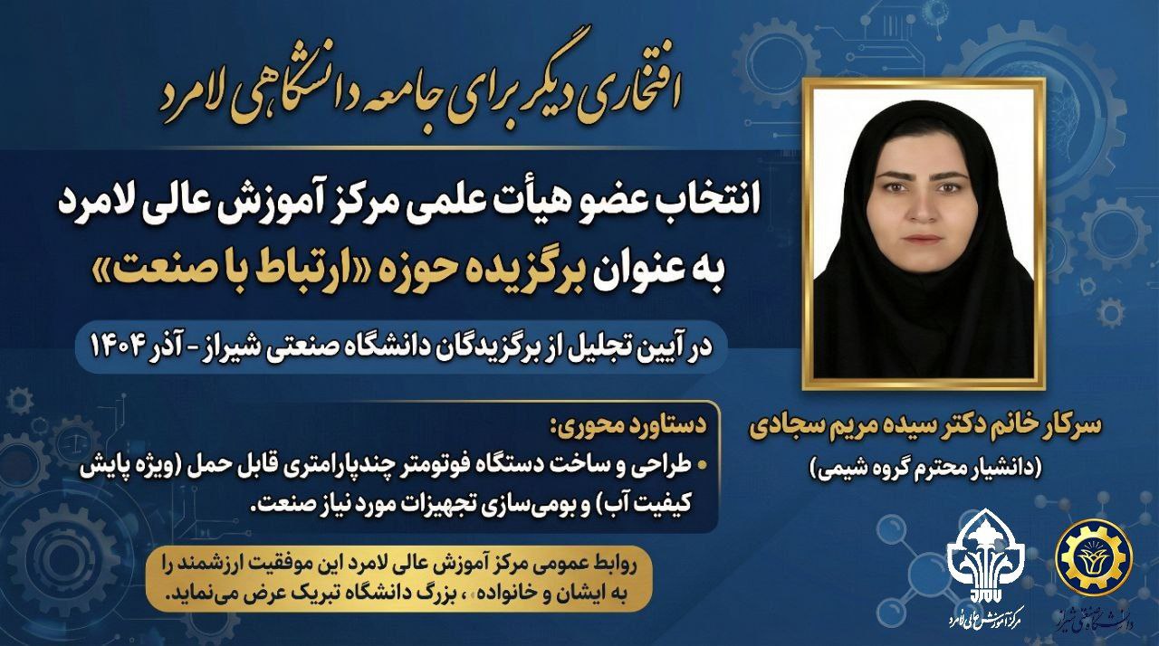 در این نشست تخصصی که با حضور اعضای هیأت رئیسه و جامعه دانشگاهی برگزار گردید، از دکتر سیده مریم سجادی، دانشیار گروه شیمی، بابت فعالیت‌های پژوهشی مسئله‌محور و تلاش مؤثر در جهت بومی‌سازی تجهیزات آزمایشگاهی مورد نیاز صنعت، تقدیر به عمل آمد. بنا بر اعلام معاونت پژوهش و فناوری دانشگاه صنعتی شیراز، ایشان به عنوان منتخب این دانشگاه جهت معرفی به وزارت علوم، تحقیقات و فناوری در سال ۱۴۰۴ برگزیده شده‌اند.