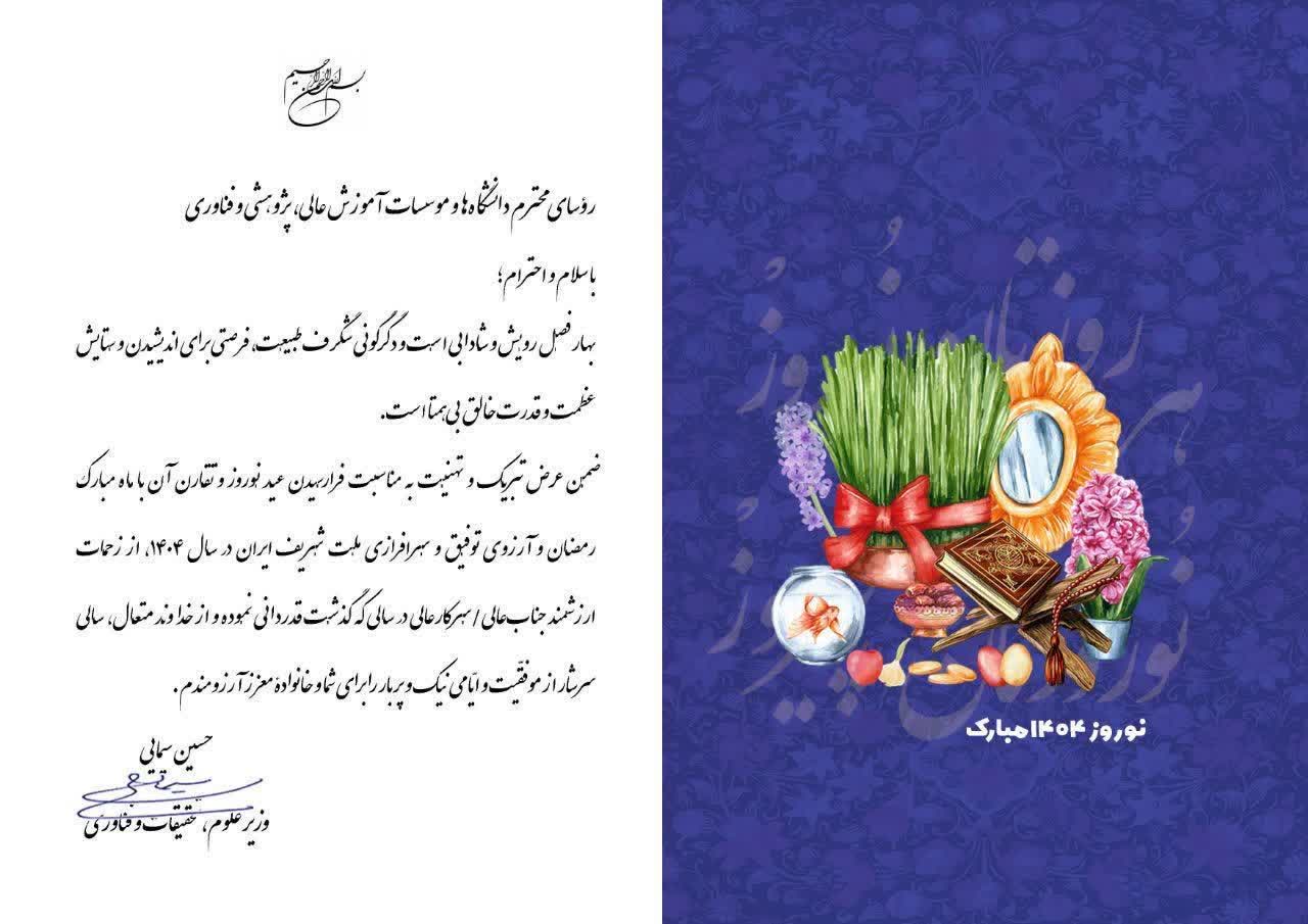 ضمن عرض تبریک و تهنیت به مناسبت فرارسیدن عید نوروز و تقارن آن با ماه مبارک رمضان و آرزوی توفیق و سرافرازی ملت شریف ایران در سال ۱۴۰۴، از زحمات ارزشمند جنابعالی/سرکارعالی در سالی که گذشت قدردانی نموده و از خداوند متعال، سالی سرشار از موفقّیت و ایّامی نیک و پر بار را برای شما و خانوادۀ معزز آرزومندم.