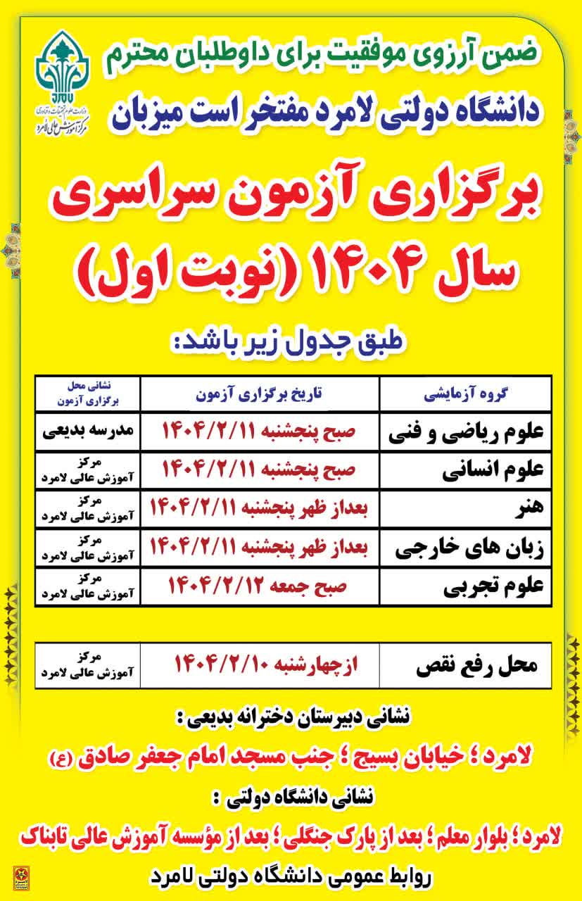 وی با بیان اینکه آزمون در سه نوبت، شامل صبح و عصر پنجشنبه ۱۱ اردیبهشت ۱۴۰۴ و صبح جمعه ۱۲ اردیبهشت ۱۴۰۴ برگزار می‌شود، افزود: محل برگزاری آزمون‌ها مرکز آموزش عالی لامرد و دبیرستان دخترانه بدیعی می باشد.