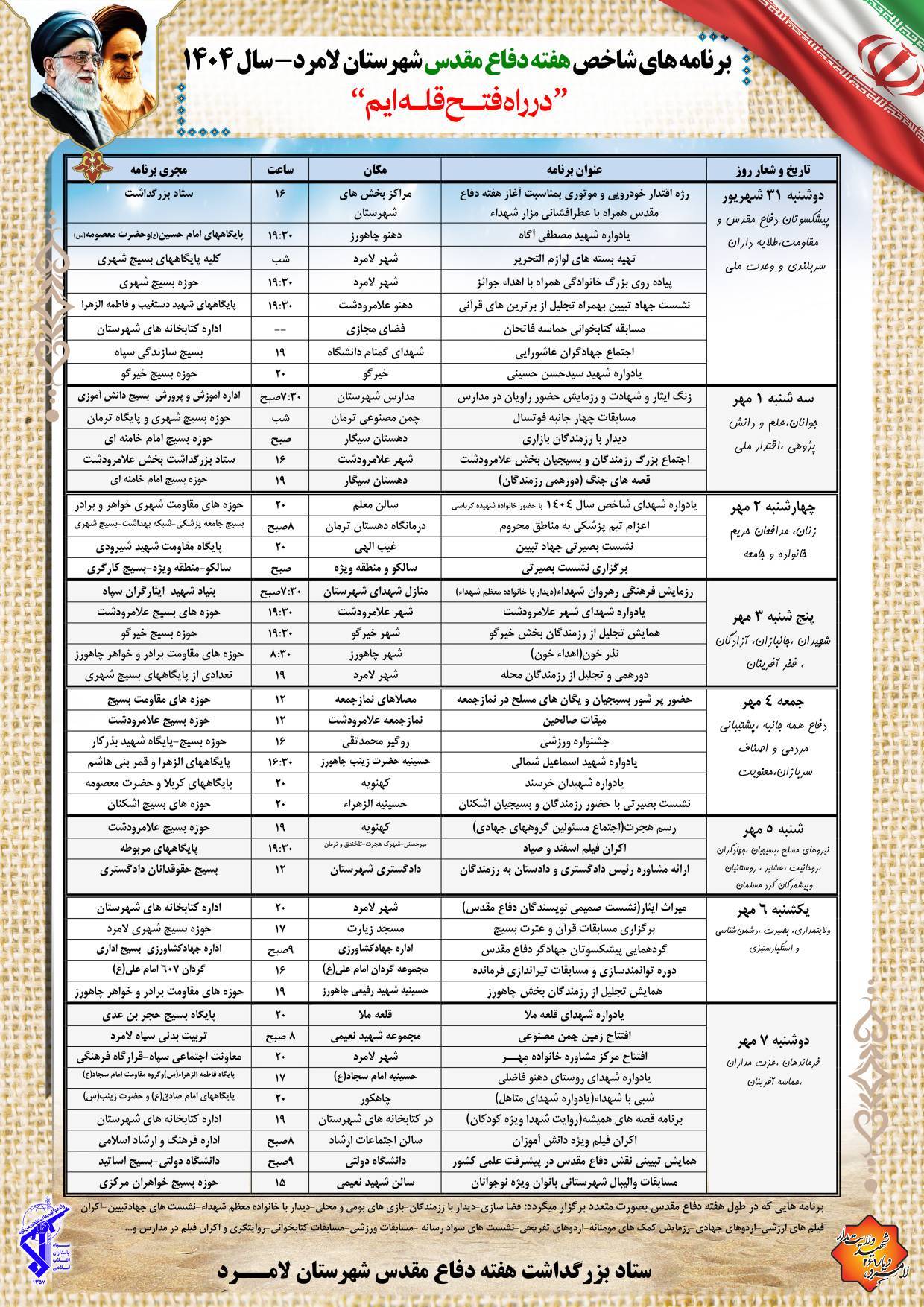 هفته دفاع مقدس فرصتی است برای یادآوری دلاوری‌ها، ایثار و حماسه‌آفرینی رزمندگان و پاسداشت فرهنگ مقاومت و خودباوری ملی. به همین مناسبت، در شهرستان لامرد مجموعه‌ای از برنامه‌های بزرگداشت طبق تقویم رسمی این ایام تدارک دیده شده است.
